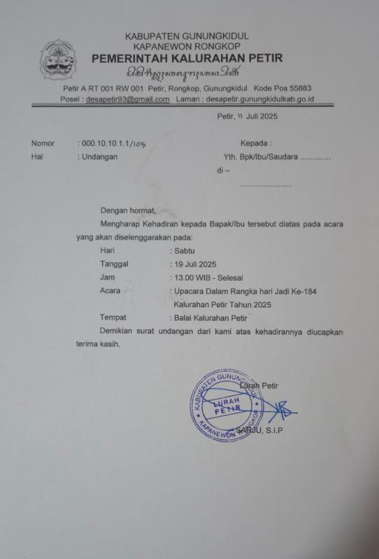 Petir,Sidasamekta//Sabtu Pahing, 19 Juli 2025 tepat jam 13.00 wib dilaksanakan Upacara Peringatan Hari Jadi ke-184 Kalurahan Petir. Acara ini adalah puncak kegiatan Ulang Tahun Kalurahan Petir. Bertempat di halaman pendopo Balai Kalurahan, ratusan peserta Upacara memenuhi halaman Balai Kalurahan bahkan sampai ke jalan raya, meliputi Pamong Kalurahan, Bamuskal, Lembaga Kemasyarakatan Kalurahan, Kader Kesehatan, Ibu-ibu PKK, serta Lembaga Masyarakat dari 13 padukuhan menjadi peserta Upacara. Selain itu hadir sebagai tamu Undangan yakni Kepala Dinas Kebudayaan Kabupaten Gunungkidul, Tim Monitoring Desa/Kalurahan Budaya D.I.Yogyakarta, Ketua Dewan Kebudayaan Kapanewon Rongkop, serta para Donatur kegiatan. Upacara Peringatan dipimpin oleh Lurah Sarju,S.I.P. yang bertindak selaku Pembina Upacara.