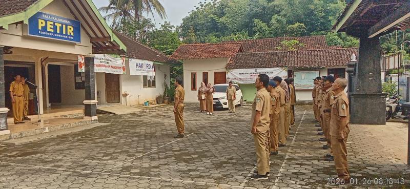 Petir,Sidasamekta//Senin Pagi,26 Januari 2026 Lurah beserta Pamong Kalurahan Petir melaksanakan kegiatan Apel Pagi. Kegiatan rutin ini dilaksanakan setiap awal pekan sebelum memulai kegiatan penyelenggaraan Pemerintahan di Kantor Kalurahan Petir.