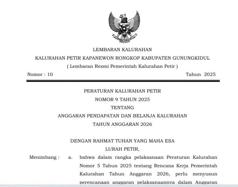 Petir,Sidasamekta//Pemerintah Kalurahan Petir dalam hal ini Lurah Petir Bersama Badan Permusyawaratan Kalurahan Petir secara resmi telah menyepakati dan menerbitkan Peraturan Lurah Nomor 9 Tahun 2025 tentang Anggaran Pendapatan dan Belanja Kalurahan Petir Kapanewon Rongkop Kabupaten Gunungkidul Tahun Anggaran 2026.
