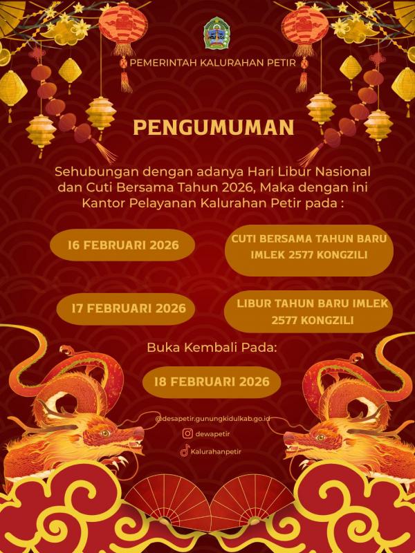 Selanjutnya Pelayanan di Kantor Kalurahan Petir kembali buka pada hari Rabu, 18 Februari 2026.