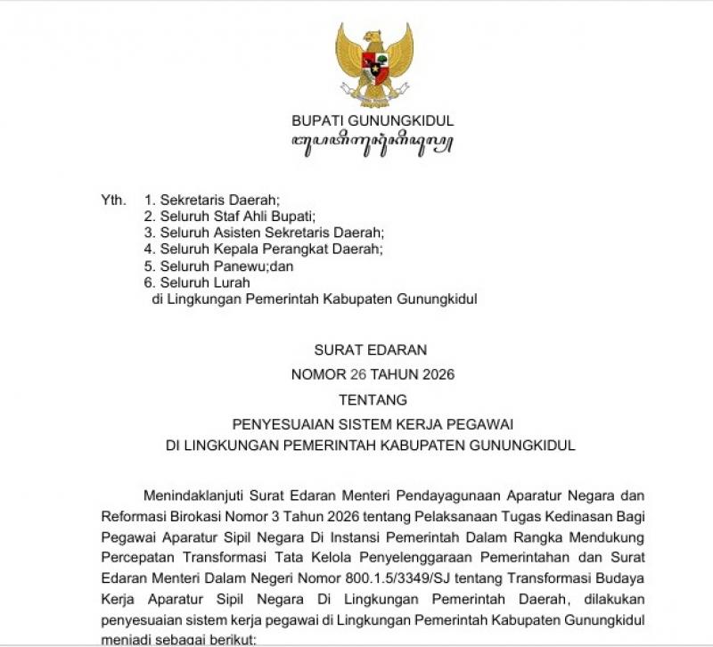 Bupati Gunungkidul menerbitkan SURAT EDARAN NOMOR 26 TAHUN 2026 TENTANG PENYESUAIAN SISTEM KERJA PEGAWAI DI LINGKUNGAN PEMERINTAH KABUPATEN GUNUNGKIDUL.